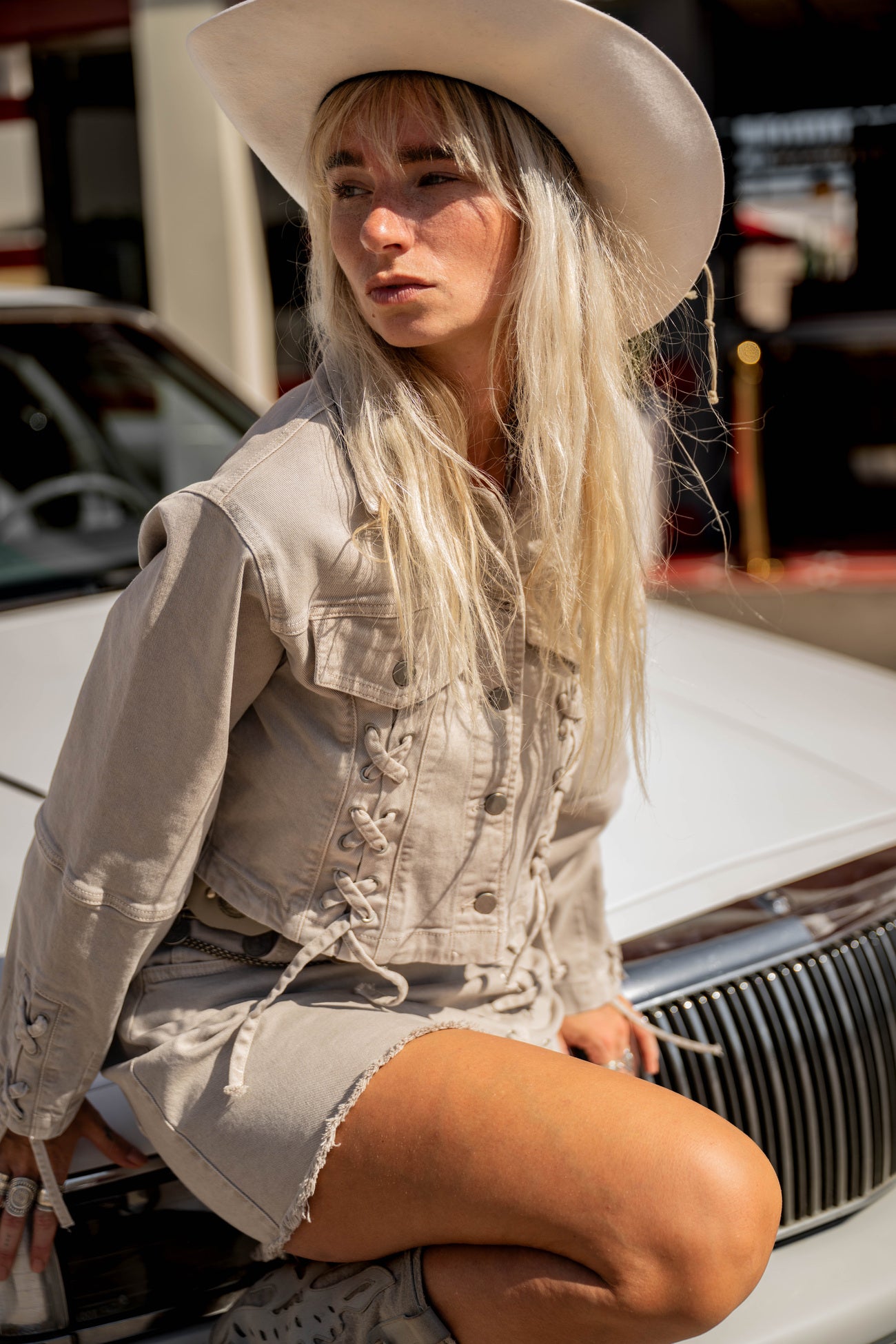 Verder sluit Alexa perfect aan bij de Destination Pink vibe. Stoer denim combineert moeiteloos met zachte tinten, fris wit en dusty pink. Voeg een harness bag of western belt toe voor extra edge. Zo wordt je outfit direct sterker en uitgesprokener.