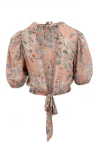 Product gegevens: Gemaakt van een luchtige stof, heeft een bloemenprint, ronde hoge hals, kan in de nek en op de rug gestrikt worden, valt open op de rug, licht pof mouwtje, elastiek bij de mouwen